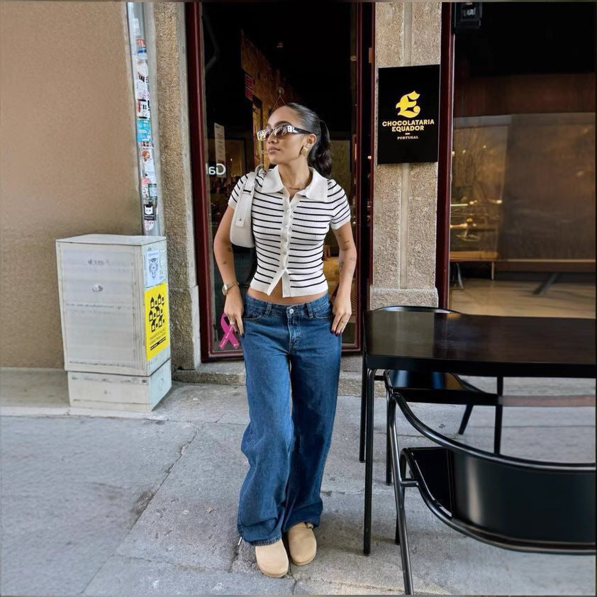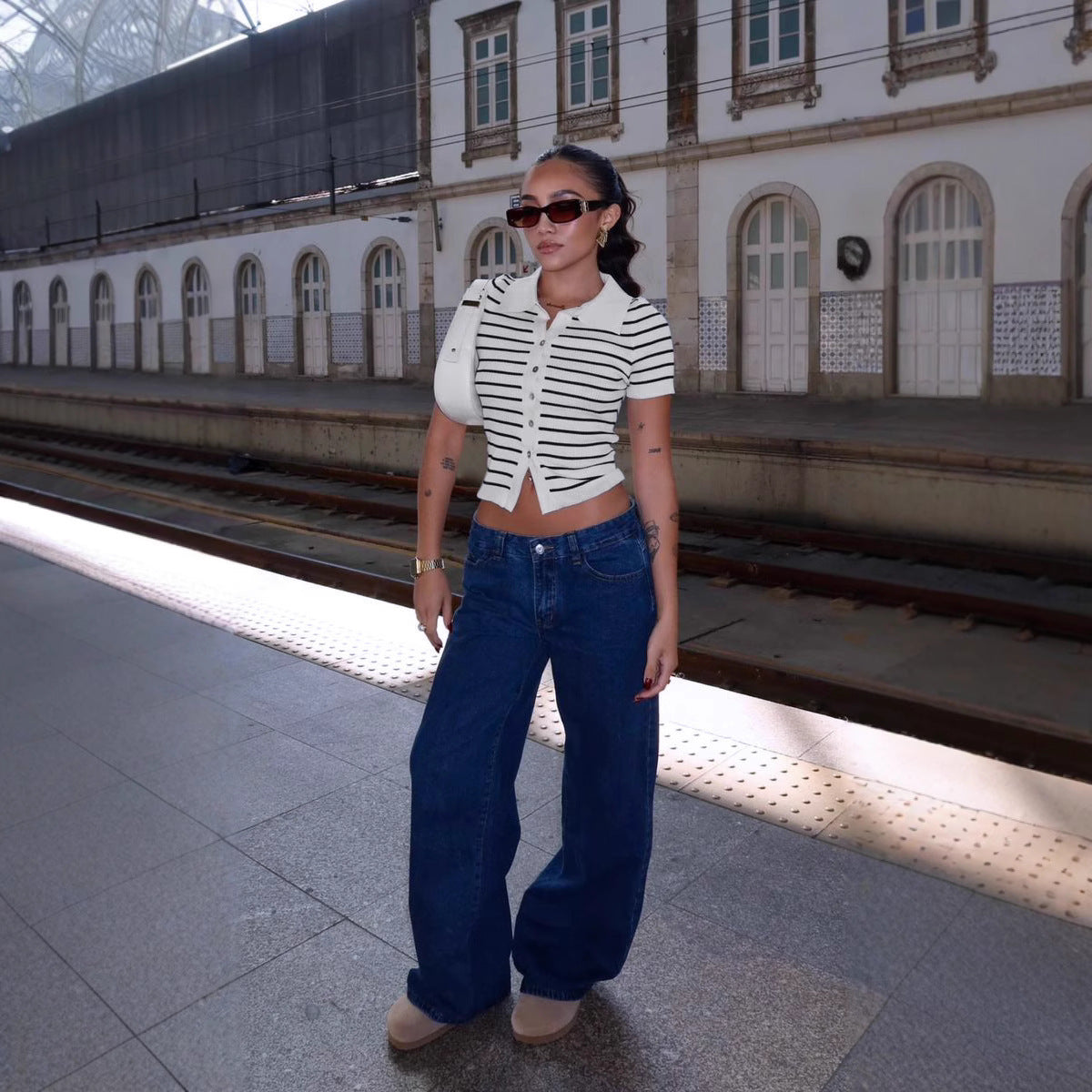Contrast Color Striped Wool Short Sleeve Single Row Button Cardigan Top Women
