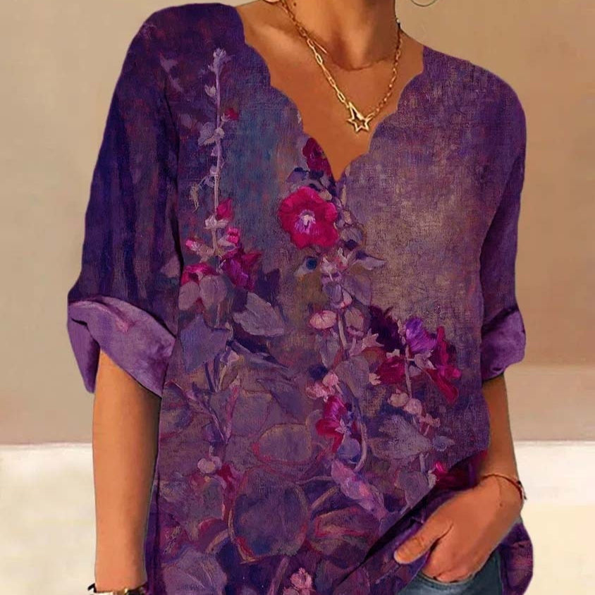 European And American Autumn Fluted Collar Cotton And Linen Retro Printed Shirt Women